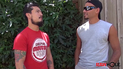 Tan Puerto Rican stud Antonio Biaggi leans against a shady wall rubbing his crotch when sexy Asian bottom Cory Koons takes the bait and strikes up a conversation. After a halting few sentences in broken Spanglish, they head inside and Biaggi feeds his massive cock to Koons. Cory has to open wide to get the thick caramel-brown tool down his throat. Antonio pulls his shirt up behind his neck, whacking his dick while Cory slobbers on his low-hanging nuts.