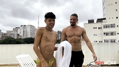 Hanry Japa leaves a card for his bf Travis that he's having an afternoon swim by the pool. That's not ALL he's having! He sees horny muscle stud Danny Toro there when he climbs out of the water and they're off to the races, kissing and grinding their thick swollen crotches together. Up in the hotel room they doff their duds and rub their dicks on the couch. Daniel spreads his powerful thighs open while Hanry gets a musky mouthful of hot Brazilian sausage, and our boy gets the message that this muscleman wants his big hairy ass plowed.