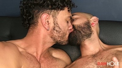 Lying on his side, Kike opens his legs wide for Ruben to give him all he's got. He turns to nibble on Ruben's thick sensuous lips and wraps his arm around his neck. A thick coat of precum makes the drilling smoother, and Ruben's at the boiling point. He pulls out to splatter his sperm then breeds it back in. Kike beats his stiff rod in perfect time with Ruben's rough thrusts and shoots his own hefty wad across his furry chest and abs. Drenched in two loads, he pulls Ruben down into one more deep kiss.